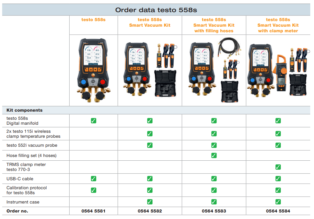 در تصویر زیر میتوانید پارتنامبرهای مختلف گیج دیجیتال تستو Testo 558S را مشاهده کنید. این دستگاه در چهار مدل متفاوت عرضه میشود و مجموعهی ما هر چهار مدل را بهصورت کامل موجود و قابل سفارش دارد.