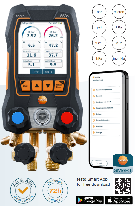 گیج-منیفولد هوشمند Testo 558s یکی از پیشرفتهترین ابزارهای تست و اندازهگیری در صنعت تبرید و HVAC است که با طراحی مدرن، دقت بالا و قابلیت اتصال بیسیم، تجربهای کاملاً جدید و حرفهای به تکنسینها ارائه میدهد. نمایشگر لمسی بزرگ، رابط کاربری سریع و امکان مشاهده نمودارهای اندازهگیری، کنترل و تحلیل سیستم را بسیار سادهتر میکند.